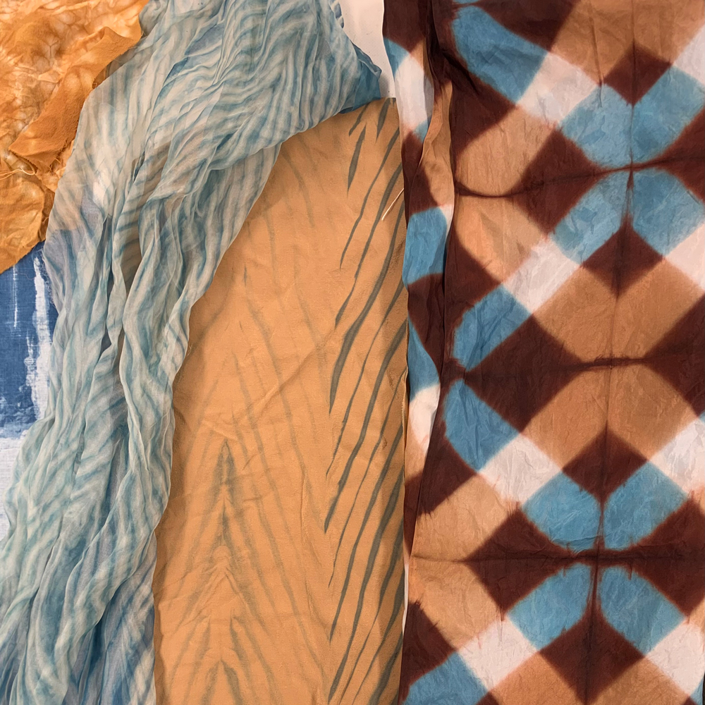 Du får lära dig shiboritekniker, med ursprung från Japan. Shibori är ett samlingsnamn för flera olika tekniker där man genom att vika, pressa och syr reserverar delar av tygets yta innan färgning. På så sätt skapas unika mönster där tyget reserverats. Du får även pröva olika sätt att arbeta med Ekoprint och Bundle dye där pigment och former från växter överförs till tyg genom värme och press. Teknikerna och betningsmetoderna skapar både diffusa och fotografiska mönster.